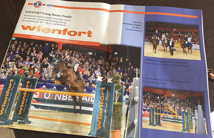 Wie schon in den vergangenen Jahren unterstützen wir auch 2017 wieder den K+K Cup in der Halle Münsterland in den Prüfungen für 7 und 8 jährige Springpferde mit unserer WIENFORT-YOUNG-HORSES-TROPHY. In den Prüfungen, welche in zwei Qualifikationsprüfungen am Freitag und einer Finalprüfung am Samstag ausgetragen werden, wird dann der Gesamtsieger ermittelt.